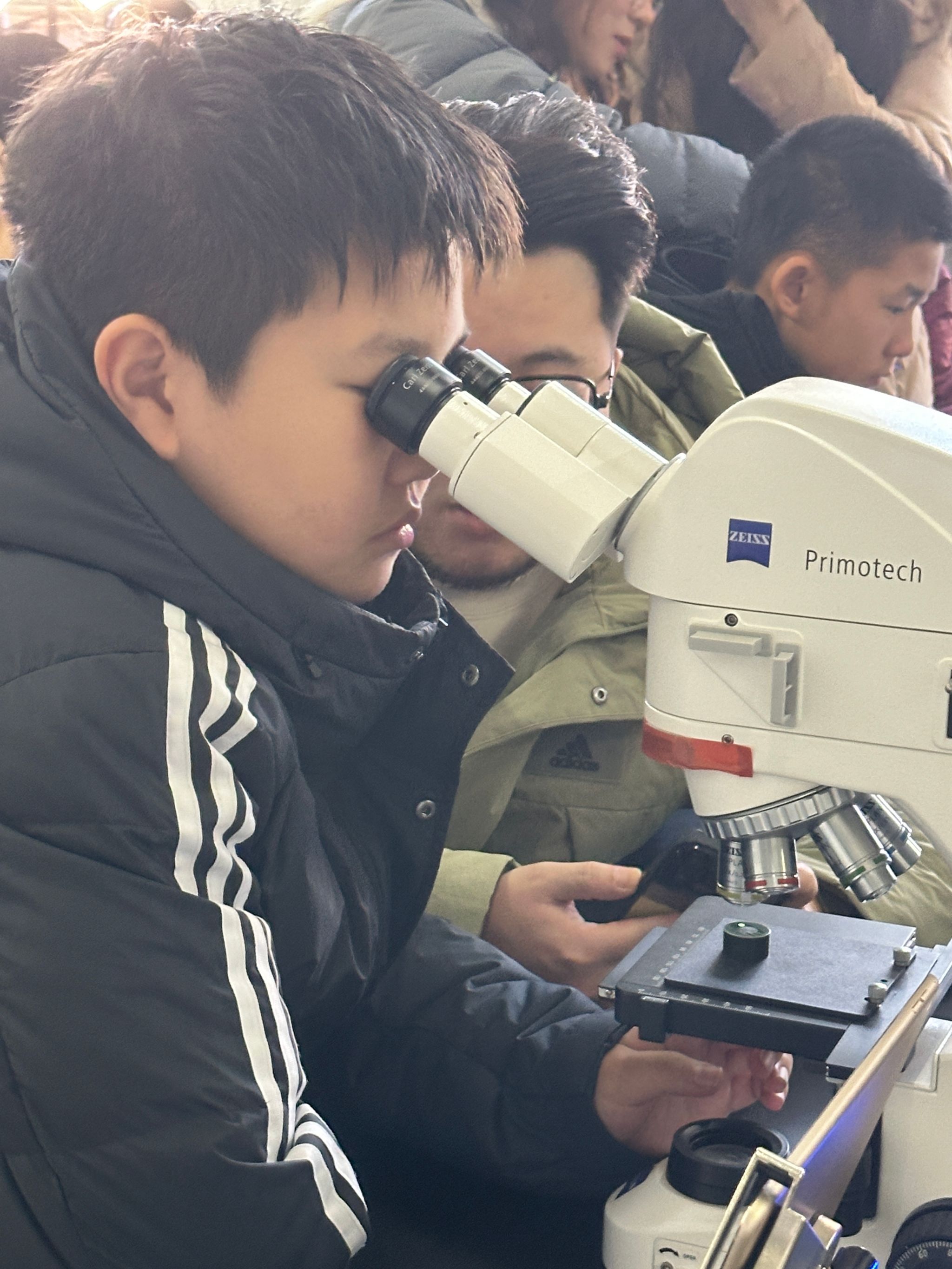 讲解结束后,老师们还在现场给孩子喝家长们演示神奇的材料实验,从形状记忆合金到热点转换材料,再到有趣的电磁流体实验都引得孩子们阵阵惊叹。除此之外,每个孩子还在戚琳老师的悉心指导下,亲身体验操作显微镜,并观察不同样品的金相组织形貌,其中工具钢W18Cr4V铸态组织呈现如古化石搬的美,给孩子们留下了深刻印象,让孩子们了解到原来材料微观组织世界竟蕴含着如此绚丽之美。